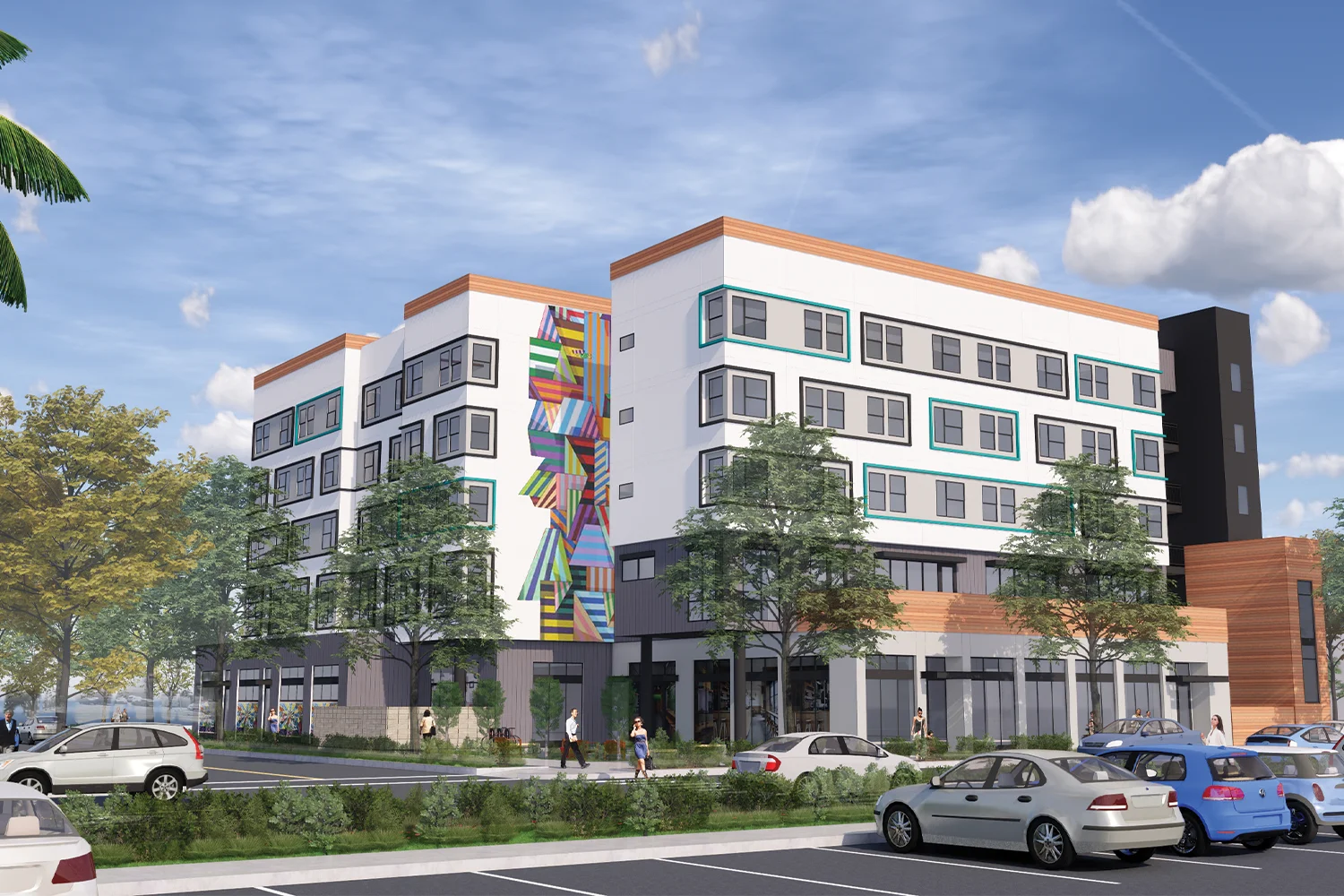 2nd and B Street is a mixed-use Permanent Supportive Housing community with a ±13,000 SF shelter. The five-story building is comprised with the shelter at the base of the building and four levels of residential above it, totaling 56 units. The site offers a public plaza near the entrance, private outdoor courtyard for residents, and over 2,000 SF of additional residential services.