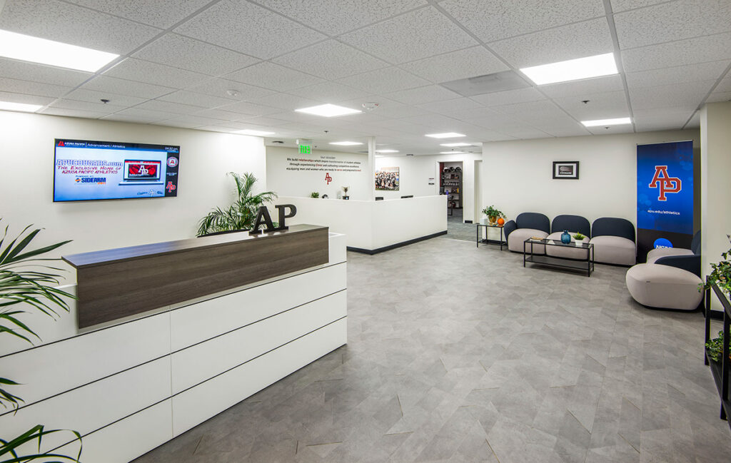 ADC designed the interior redesign of a prior warehouse that was converted into a Student Commons space. This included a significantly larger, more modern and open bookstore, a brand-new coffee shop, and front renovations to a second eatery and market. Each food tenant incorporated a unique dynamic design to provide variety for branding. The central feature of the space included a large multi-purpose area that is utilized for dining, studying, and entertainment. Rising from the lower level is a large bleacher seating installation that provides optional places for dining and an optimal layout for over a hundred students to view lectures or entertainment. Offices for the university’s athletic department, a storage mezzanine, and a small art gallery round out the project program. Materials included the use of multiple natural wood veneers, colorful and geometric tiles, and bold sprinkles of the Universities’ signature red. Bold, graphic, front illuminated lighting also adds a welcoming and contemporary touch to the space while providing clear wayfinding.