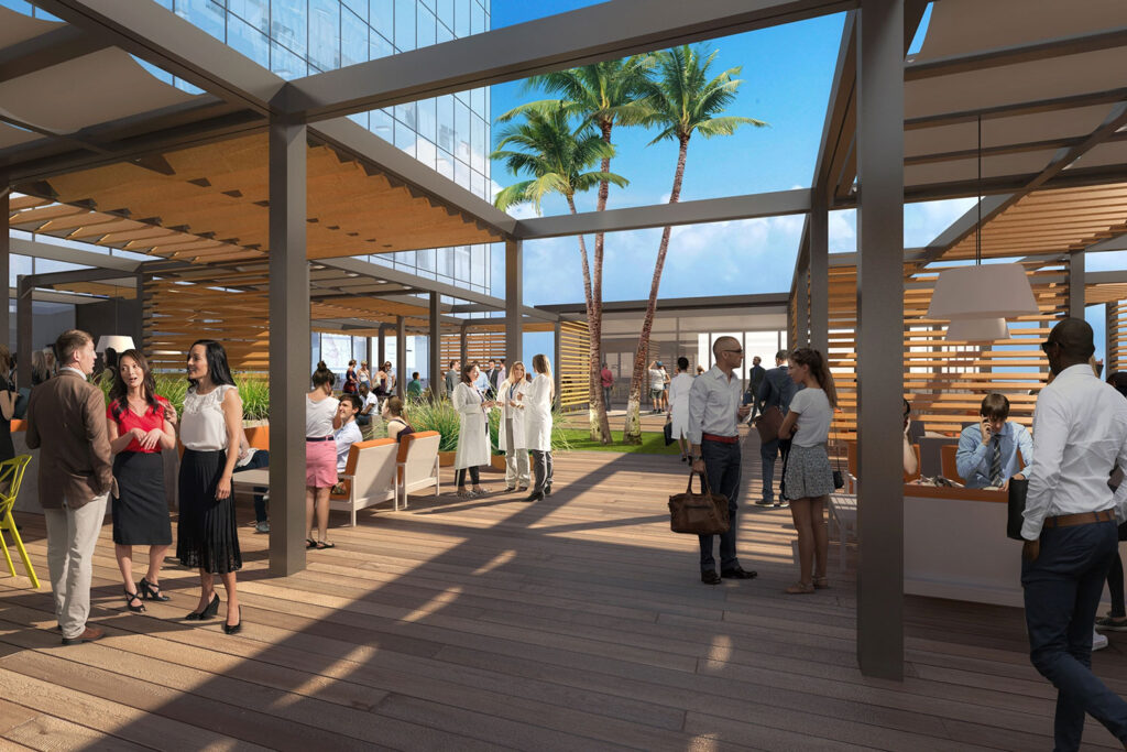 ADC designed and rendered this tower over a weekend as the pressure was on from the client. This 350 ft tower was proposed to a medical group for their new corporate location in a prominent cityscape. On the lower streetside of the building, retail shops and amenities are available for passersby, while the majority of the building would be medical office suites. The building also has a roof top area with views overlooking the ocean. The space houses restaurants and lounges for the patrons to enjoy while either working on site, waiting for appointments, or stopping by just to have a bite to eat.