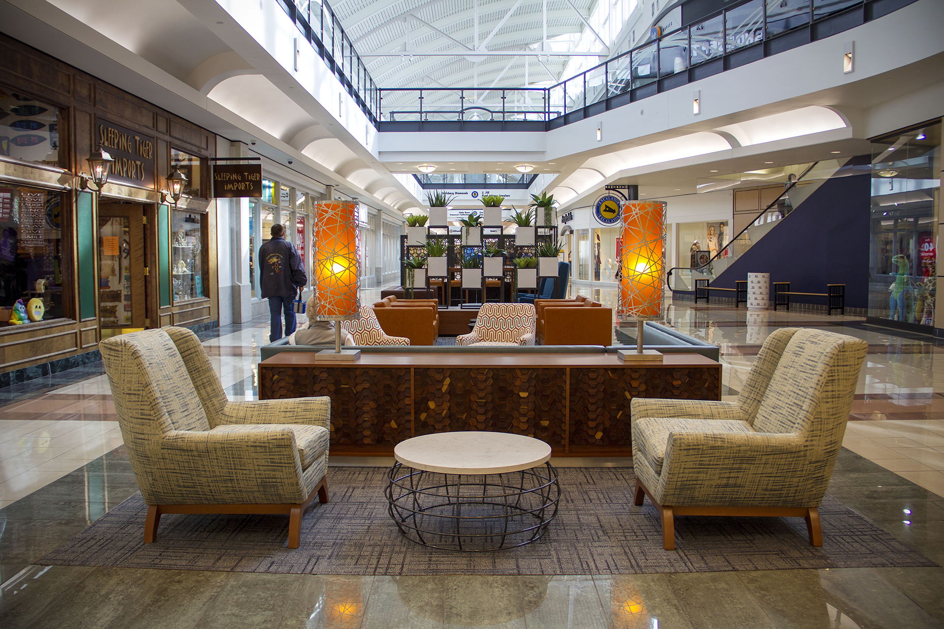 GGP, owners and operators of Rivertown Crossings, presented Architecture Design Collaborative with the opportunity to upgrade the mall without a total renovation. The exterior highlights stores with faux windows and backlit graphics. The new finishes on the building, new guardrails, new awnings, and decorative lighting all add to the refresh. ADC enhanced the existing high traffic areas with paint, carpet, and furniture. The bulkhead around the Center Court received awnings and windows giving it the look of third story outdoor façade. The food court paint and materials highlight each food tenant individually. Entrances, common concourse ceilings, bulkheads, railings, and elevator shaft were all painted revitalizing each area of the mall.
