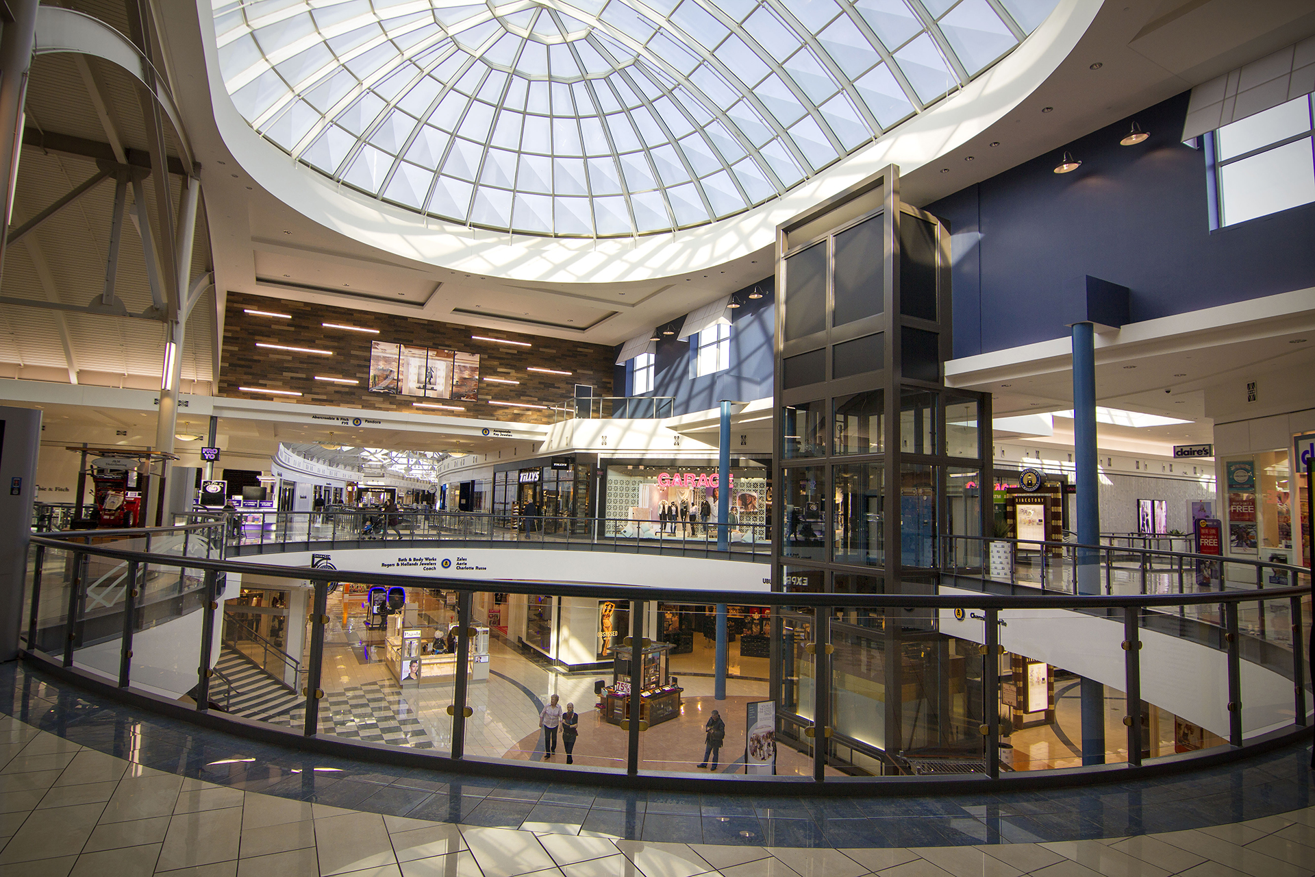 GGP, owners and operators of Rivertown Crossings, presented Architecture Design Collaborative with the opportunity to upgrade the mall without a total renovation. The exterior highlights stores with faux windows and backlit graphics. The new finishes on the building, new guardrails, new awnings, and decorative lighting all add to the refresh. ADC enhanced the existing high traffic areas with paint, carpet, and furniture. The bulkhead around the Center Court received awnings and windows giving it the look of third story outdoor façade. The food court paint and materials highlight each food tenant individually. Entrances, common concourse ceilings, bulkheads, railings, and elevator shaft were all painted revitalizing each area of the mall.